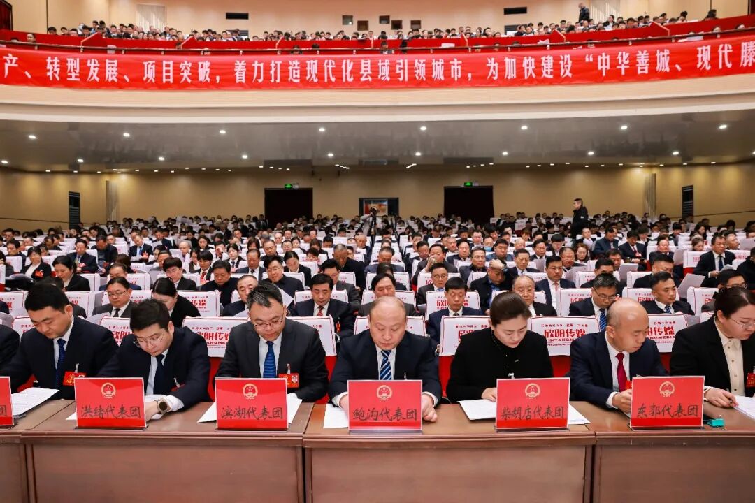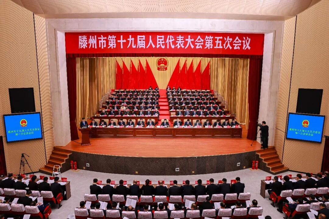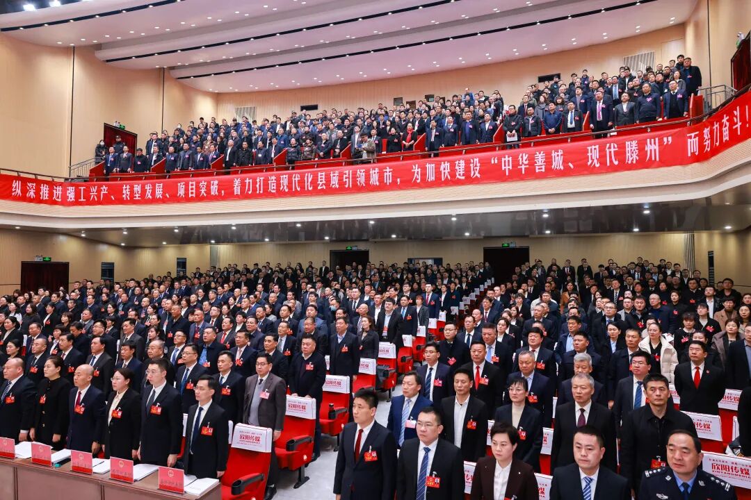 滕州剧院内庄重简朴、气氛热烈,主席台帷幕正中的国徽在鲜艳的红旗映衬下熠熠生辉,二楼眺台上“纵深推进强工兴产、转型发展、项目突破,着力打造现代化县域引领城市,为加快建设‘中华善城、现代滕州’而努力奋斗”的巨型标语格外醒目、催人奋进。